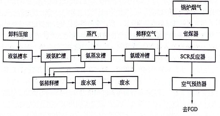 脫硝后煙氣經空氣預熱器熱回收后進入靜電除塵器。然后經FGD裝置脫硫排放。每臺鍋爐配設一套scr反應器,每兩臺鍋爐共用一套液氨貯存和供應系統(tǒng)。