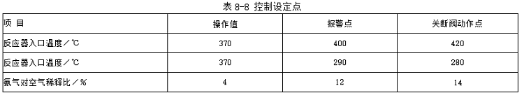 (2)氨儲存供應系統(tǒng) 計量的氨氣可依溫度和壓力修正系數(shù)進行修正。從煙氣側所獲得的no,信號饋入有計算所需氨氣流量的功能??刂破骼冒睔饬髁靠刂扑璋睔猓鼓柋染S持固定。氦氣供應管線上有一個緊急關斷裝置,當入口煙氣溫度過低、過高或氨空氣稀釋比過高時,均與該裝置連鎖,迅速關斷,以確保操作安全和防止催化劑損壞。最初設定點見表8-8。