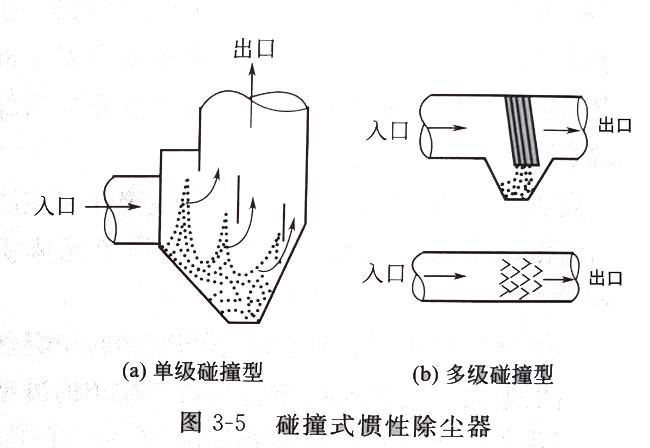 • 利用粉塵與氣體在運動中的慣性力不同,使粉塵從氣流中分離出來。在實際應(yīng)用中實現(xiàn)慣性分離的一般方法是使含塵氣流沖擊在擋板上,使氣流方向發(fā)生急劇改變,氣流中的塵粒慣性較